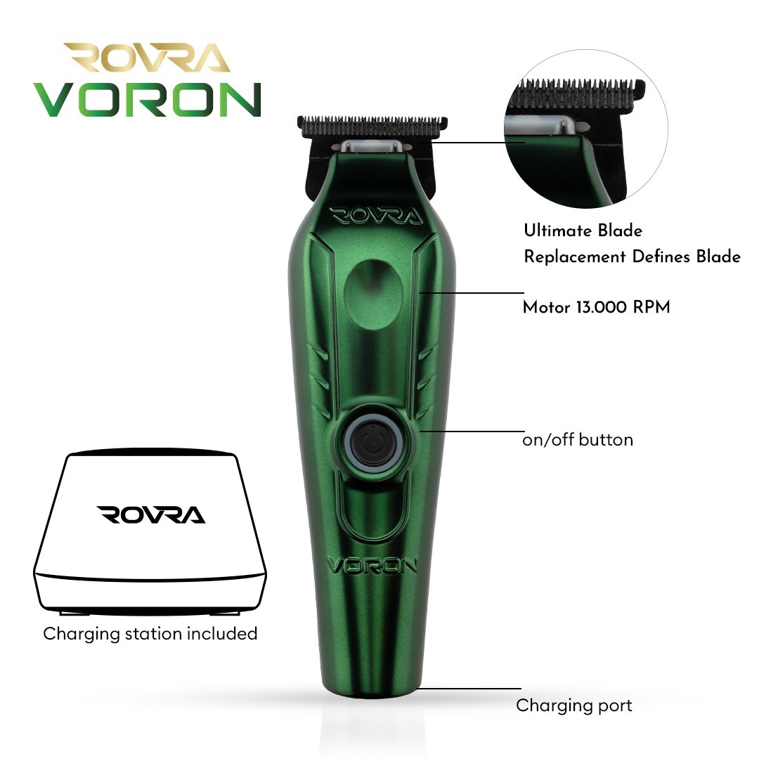 ROVRA surprinde ca de fiecare data prin inovatie si inventivitate la cotele cele mai ridicate, prezentand un nou model din gama masinilor de contur cu motor foarte puternic, vector. ROVRA vine pe piata cu un aparat foarte util si profesional in randul frizerilor. ROVRA VORON se remarca prin durabilitatea lui si aspectul modern oferit de carcasa cu efect metalizat. Se remarca prin durata de autonomie a acumulatorului de aproximativ 180 minute dupa un ciclu de incarcare de doar 120 minute. Dispune de un stand de incarcare, astfel masina de contur fiind oricand gata de actiune. Avand o greutate de 232 grame si o motorizare de 13.0000 rotatii pe minut, devine un accesoriu foarte util si de nadejde pentru orice profesionist.