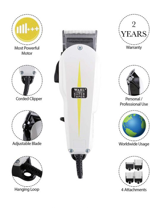 Masina de tuns Super Taper vine pe piata cu un design foarte simplu si inovativ, devenind un accesoriu foarte practic si util in randul profesionistilor.De asemenea Super Taper-ul incanta avand o greutate de 620 grame si cu o motorizare de 5500 rotatii pe minut, devenind un accesoriu foarte util si de nadejde pentru orice profesionist.Datorita lamei de tip taper pusa la dispozitie de catre cei de la WAHL si lungimii de taiere situate intre 0,7-3mm ofera o manevrabilitate cat mai practica atat in uzul profesional cat si in cel personal casnic. Masina de tuns dispune de alimentare prin cablu si de asemenea dispune de o lama metalica, accesoriu cu ajutorul caruia se pot crea lucrari(tunsori)la un nivel cat mai profesional si fara cusur.Este recomandat ca acest aparat de mare precizie si inalta calitate sa fie utilizat in conditii optime si cu mare grija pentru o durata lunga de functionare in parametrii normali.