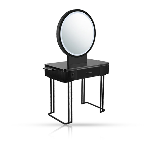 Descopera masuta de frizerie/coafor care imbina eleganta cu functionalitatea. Aceasta piesa dispune de o oglinda dubla cu LED frontal integrat, oferind o iluminare optima pentru orice sesiune de coafare sau frizerie. Descopera masuta de frizerie/coafor care imbina eleganta cu functionalitatea. Aceasta piesa dispune de o oglinda dubla cu LED frontal integrat, oferind o iluminare optima pentru orice sesiune de coafare sau frizerie. Cadrul negru metalic adauga un touch modern si sofisticat, completand designul minimalist. Cu un comutator pornit/oprit, poti controla cu usurinta iluminarea, asigurand astfel conditii perfecte de lucru.