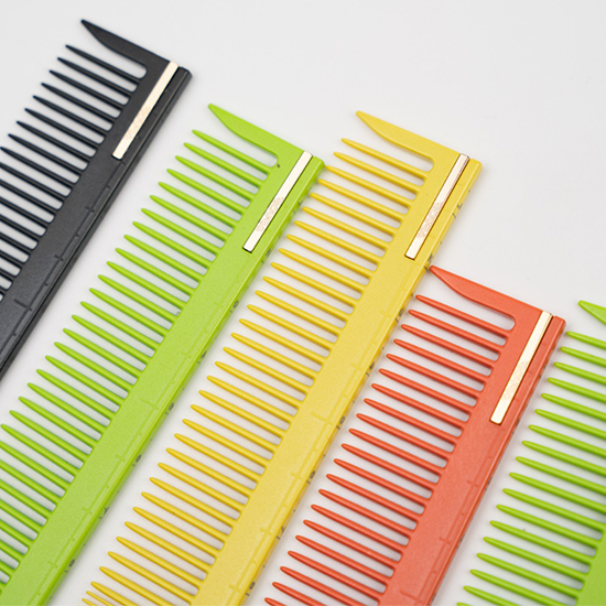 Format dintr un material de plastic foarte durabil si rezistent la caldura, beneficiaza de o flexibilitate foarte mare, avand o suprafata neteda cu dinti fini, ofera stilistului un control pentru o manevrare cat mai facila si utila pentru o atentie sporita la detalii.