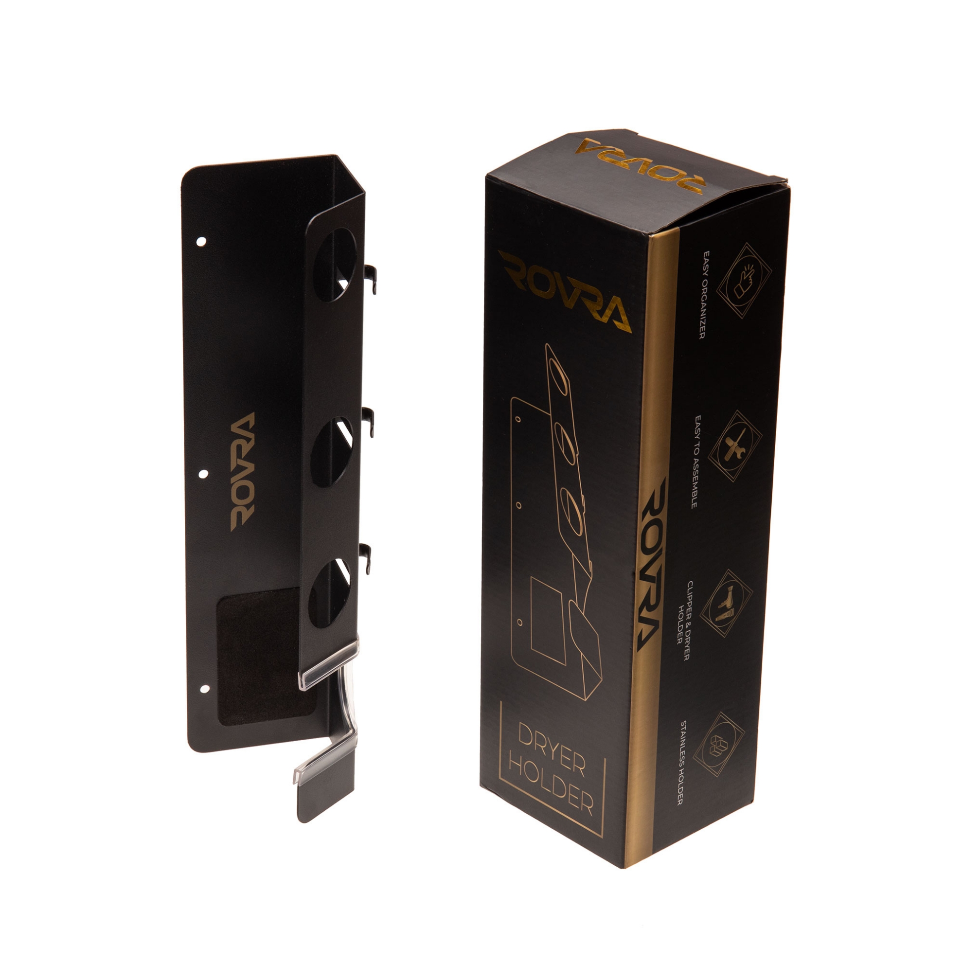 Eficientizeaza-ti spatiul de lucru cu noul suport pentru uscator si accesoriile sale. Se prinde pe perete. Este fabricat dintr-un metal rezistent si de culoare neagra, cu finish mat, astfel integrandu-se usor in orice spatiu. Acesta mai are si 3 mici carlige pentru o prindere mai usoar a masinilor de tuns/contur. Clientii apreciaza ordinea si amenajarea spatiului este un criteriu estetic de care tin cont.